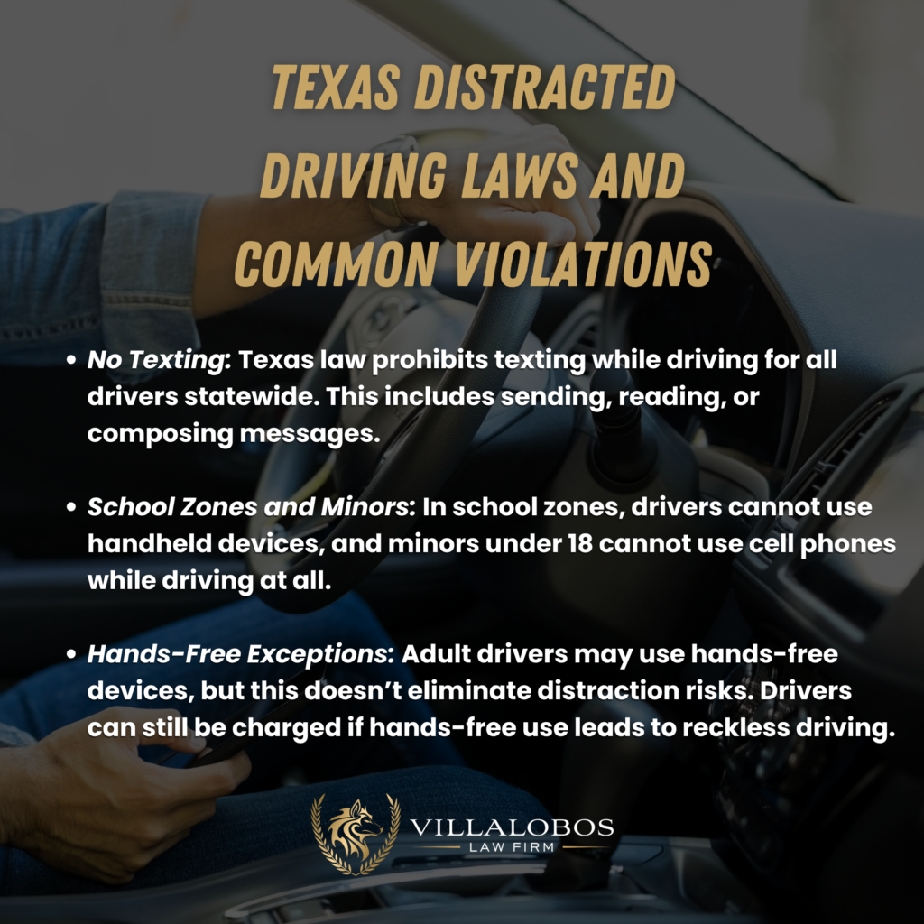 If you’ve been involved in an accident caused by a distracted driver in Texas, Villalobos Law Firm is here to help. Our experienced attorneys will guide you through the claims process, ensuring your rights are protected and working to secure the compensation you deserve. Contact us today to discuss your case and learn more about your legal options.
