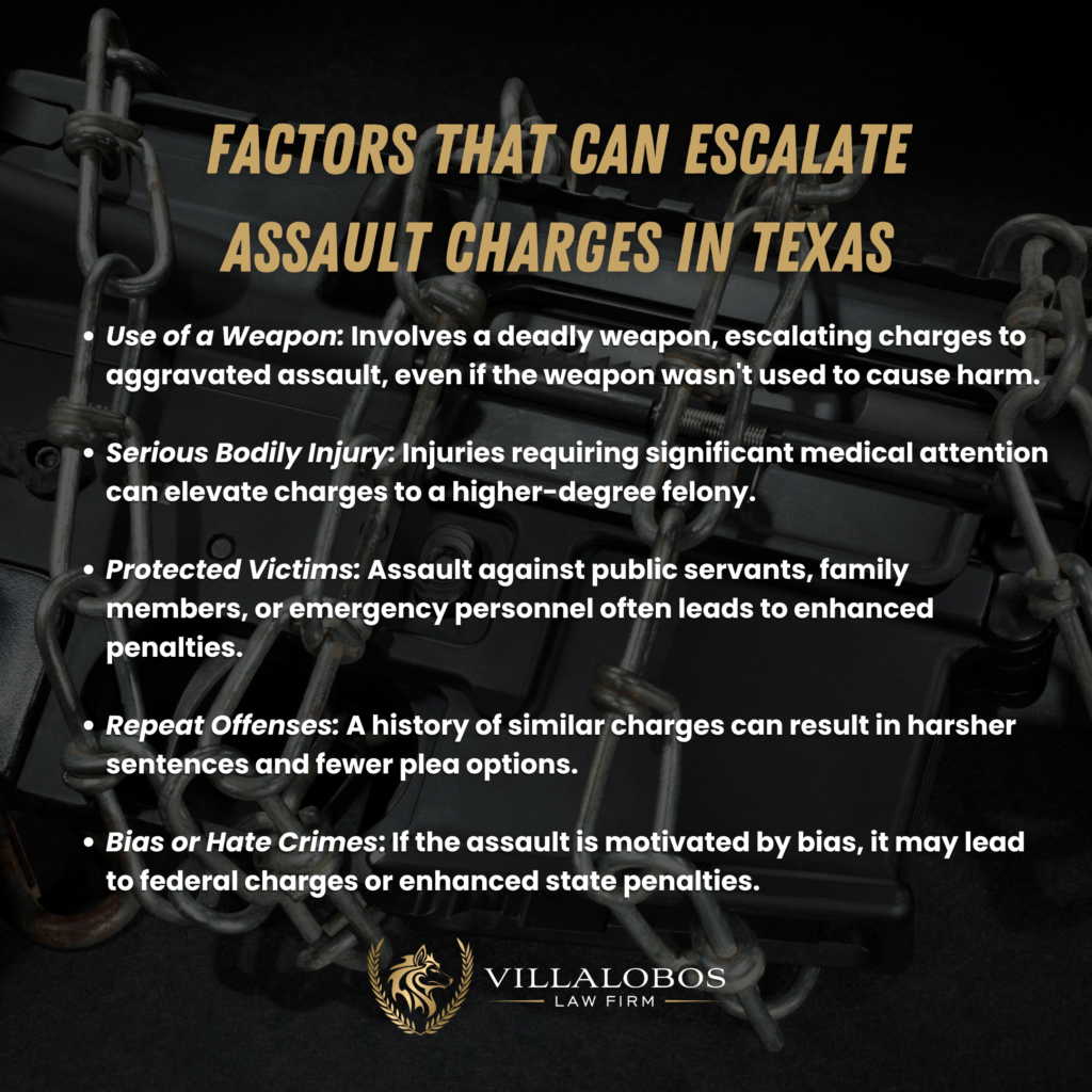 • Third-Degree Felony: Assault involving family violence or against a public servant; punishable by 2–10 years in prison.